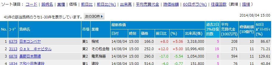 具体的には、前営業日から2日間で株価が3%以上変動した回数をカウントして、その数が多い順にソートしてある。その数が多いほど一日に何度もトレードして収益を上げる機会が多いということになる。