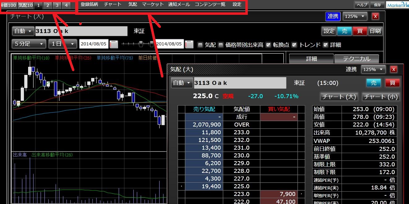 マーケットボード(板情報、複数気配、歩み値)